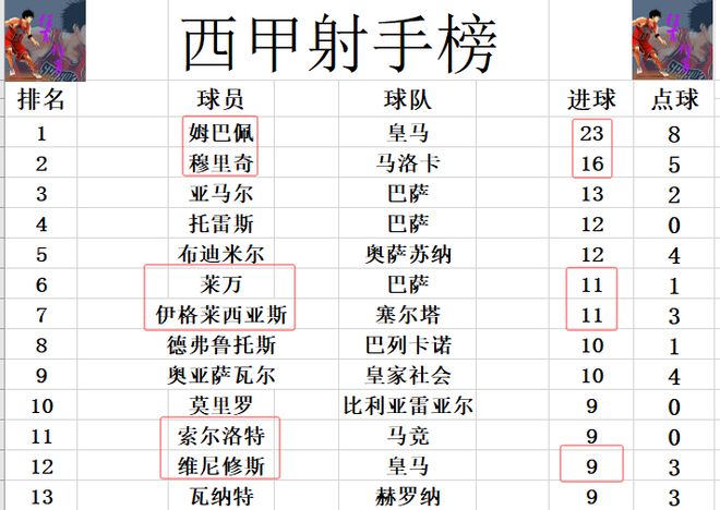 射手榜方面,姆巴佩繼續(xù)缺陣,還是23球領(lǐng)跑,不過他的優(yōu)勢還是有點(diǎn)大,榜首位置暫時沒有人能威脅到,第2的穆里奇差姆巴佩7球。伊格萊西亞斯今天打入一球后,追上萊萬,11球并列第6。維尼修斯無力破門,還是和索爾洛特等人9球剛好擠入前十。